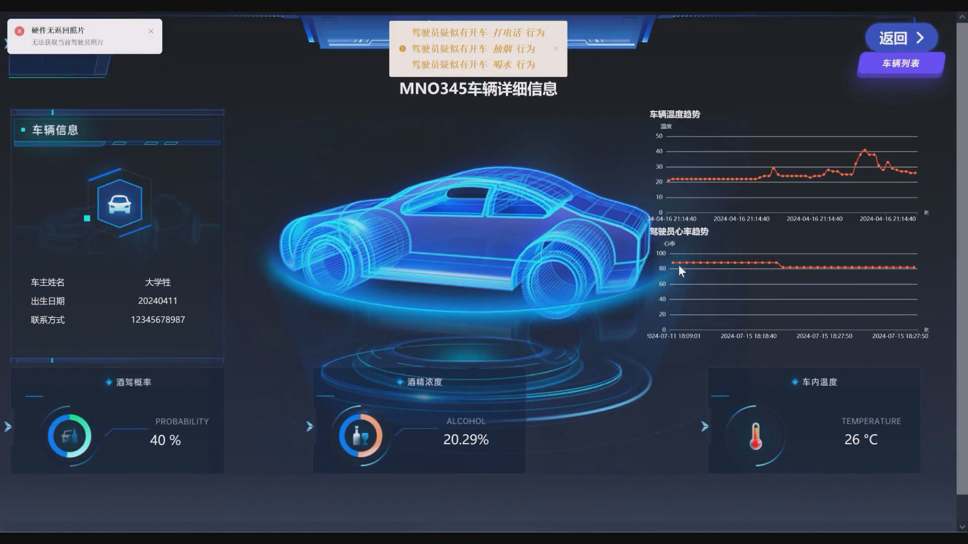 : 本项目包括身份验证、信息采集分析和数据可视化三部分,基于 STM32 硬件,获取驾驶员疲劳、心率、异常行为、酒精、车内温度及位置信息。